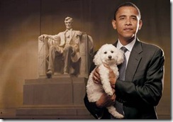 As part of a campaign to stop puppy mills, then-Senator Barack Obama posed at the Lincoln Memorial with Baby, a poodle who survived a puppy mill but lost one of her legs from the ordeal. The image will appear in the upcoming book, "A Rare Breed of Love" by Jana Kohl.